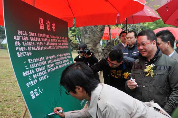 3月18日上午,30位來自不同行業(yè)、領(lǐng)域的知名企業(yè)家齊聚廣州白云國際會議中心,他們代表各自的企業(yè),共同簽署了行使綠色使命的倡議書。30個企業(yè)共同向社會提出倡議:“企業(yè)的社會責(zé)任,從種一棵小樹開始,種下一棵小樹,行使我們的綠色使命。無論是企業(yè)、社會組織還是個人,都應(yīng)攜手共建綠色家園,為建設(shè)全國低碳試點省,增加森林碳匯,打造宜居城市,建設(shè)幸福廣東,播種同心。”并承諾,這個植樹活動每年都要舉辦一次,打造一種持之以恒的綠色的企業(yè)文化氛圍?;顒蝇F(xiàn)場,30位來自不同行業(yè)的知名企業(yè)代表們充滿了熱情,扶苗、培土、踩實、澆水,每一道工序都認(rèn)真細致,他們在廣州白云國際會議中心這一廣州地標(biāo)上種下并認(rèn)養(yǎng)了芒果、玉蘭等四季常青樹種。一個多小時后,一顆顆青翠的樹苗已經(jīng)樹立成行,迎風(fēng)點頭。抬眼望去,錯落有致的樹苗猶如一條長龍,向遠方延伸,傳遞綠色的希望。這30棵綠樹象征著30個美好的綠色愿望,象征著企業(yè)作為社會經(jīng)濟的領(lǐng)跑者,為共同打造一個綠色低碳的環(huán)境而盡自己的一份責(zé)任。