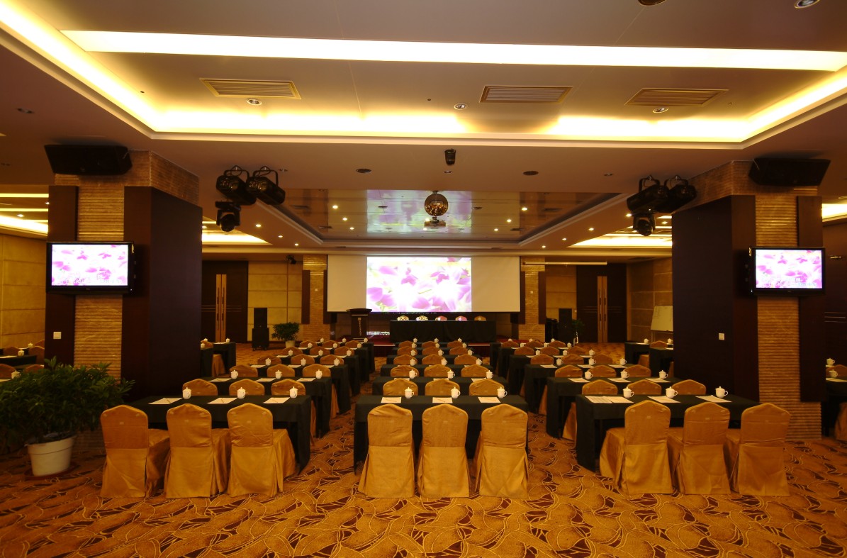 在會議廳內(nèi)面向講臺擺放一排排座椅,中間留有較寬的過道。