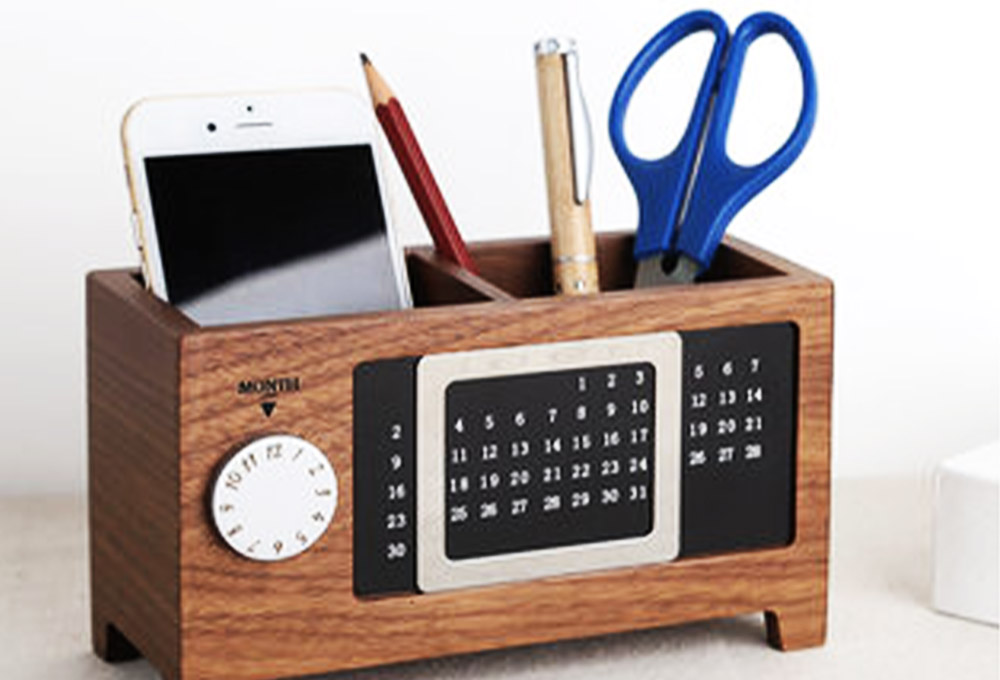 貼心的公司都會(huì)選擇員工日常的必需品作為的伴手禮,這款辦公桌上不能少的筆筒就是不錯(cuò)選擇。創(chuàng)意筆筒,不僅能夠收納常用的筆,剪刀等小物件,還有一款不用更換的萬(wàn)年歷,為桌面省出一份空間。選用櫸木材質(zhì),紋理十分清晰,很具有藝術(shù)感。